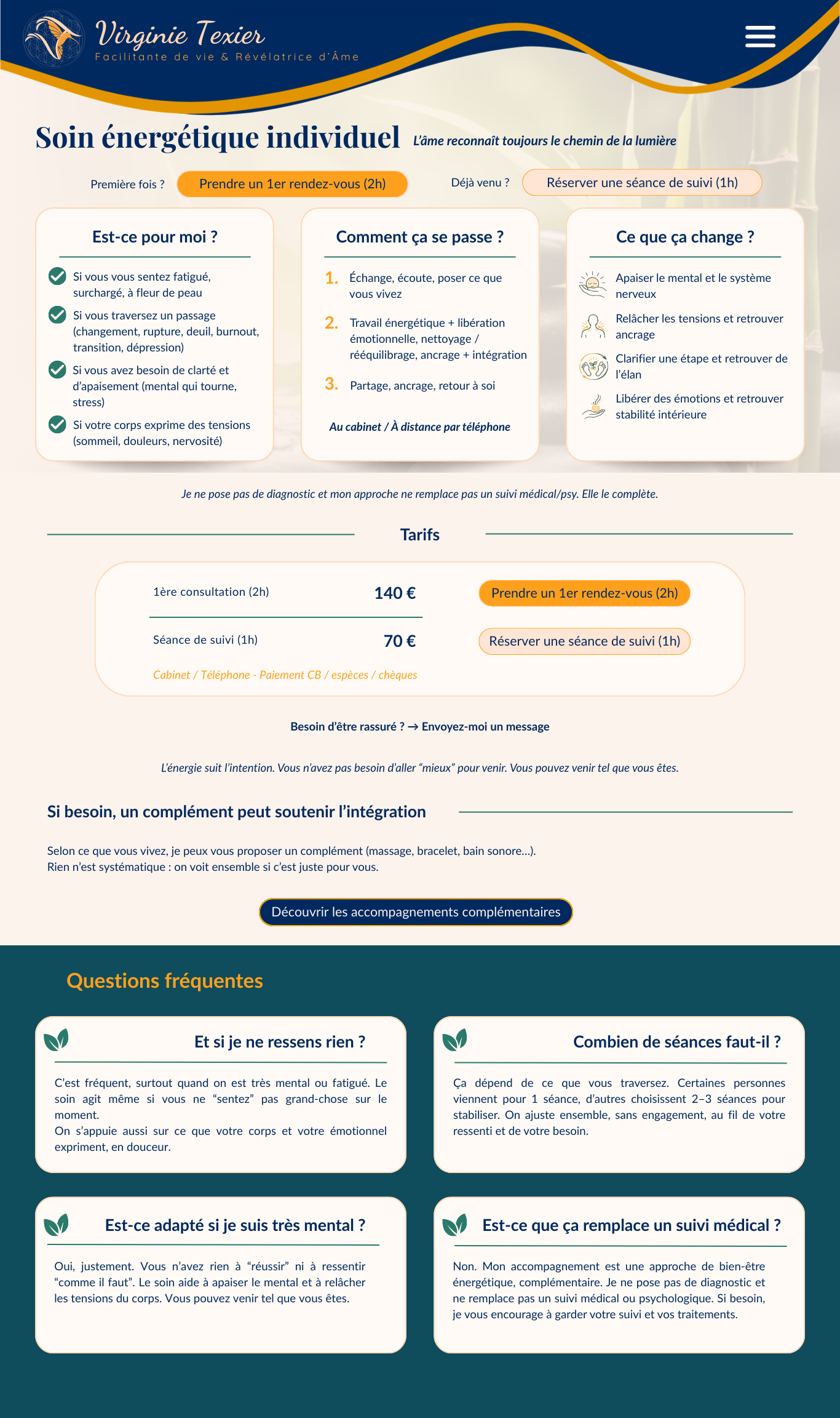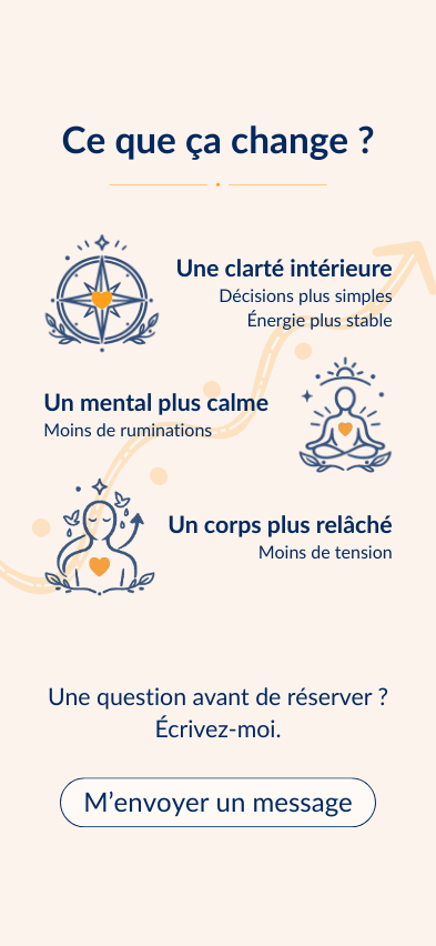 Je vous accompagne pour retrouver votre axe - apaiser le mental - relâcher le corps. Fatigue, surcharge, émotions qui débordent, période de transition. Vous pouvez venir tel que vous êtes. Vous repartez plus léger, plus recentré, plus affirmé.